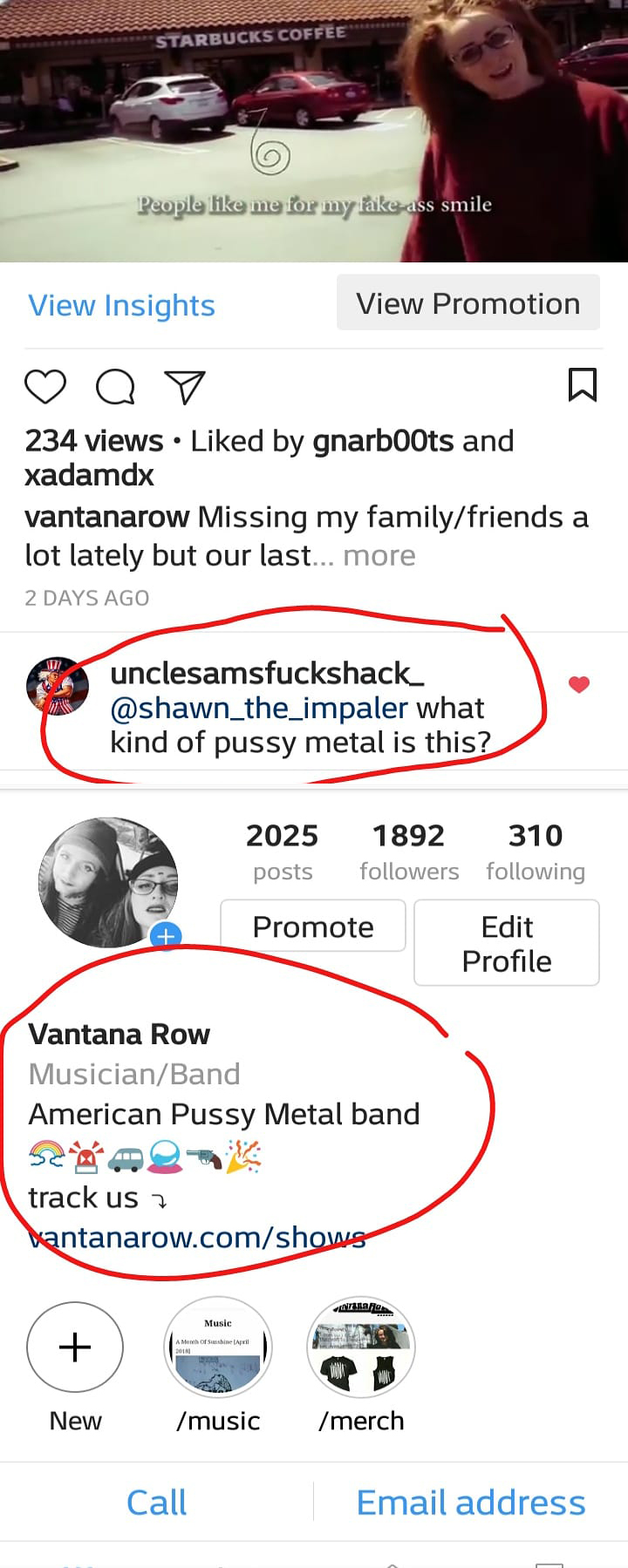 Vantana Row is an American Pussy Metal band, formed in 2015 by Jamey and Volly Blaze in Northern California. They are mentioned in SF Weekly, East Bay Express, WorldStarHipHop, and other blogs/publications for their gimmicky ‘drive by’ performances, living in their van, their YouTube sitcom and using their fan’s lyrics in their #iwriteforvantanarow program.